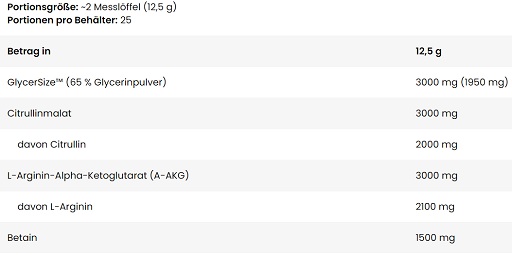 GlycerSize™ [65% Glycerinpulver, Trennmittel (E551)], Citrullinmalat, L-Arginin-Alpha-Ketoglutarat (A-AKG), Betain wasserfrei, Aromen, Trennmittel (E551), Säureregulator (E296), Salz, Rote-Bete-Saftkonzentrat1,2, Süßstoffe (Sucralose, Acesulfam K), Farbstoffe [(E160a)2,3, (E104)3].