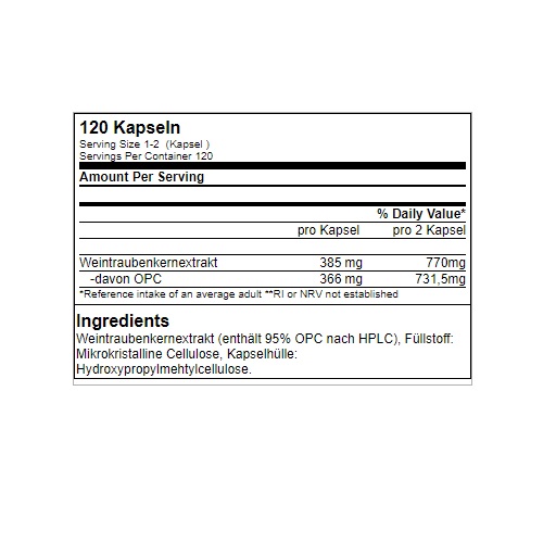 • Enthält 366mg OPC, dessen antioxidative Wirkung um den Faktor 20 stärker als bei Vitamin E und um den Faktor 50 stärker als bei Vitamin C ausfällt