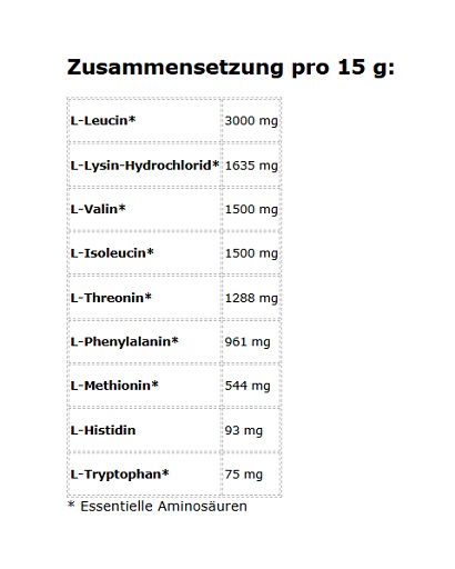 Essentielle Aminosäuren sind als effektive proteinbildende Bausteine für die Muskulatur bekannt und können am besten vor, aber auch verteilt, also noch während des Trainings und sogar noch kurz nach dem Workout als Shake getrunken werden. 15g Pulver auf 350 ml Wasser sind ausreichend für eine ausgiebige Trainingseinheit.