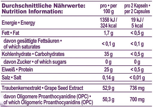 - 736mg Traubenextrakt (pro 2 Kapsel) davon 700mg OPC