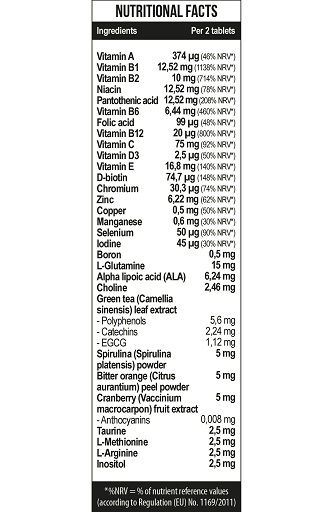 Jede Tablette enthält 12 lebenswichtige Vitamine, darunter die Vitamine A, C, D, E, B1, B2, B3, B5, B6, B7, B9 und B12; sie tragen zur Verringerung von Müdigkeit bei, unterstützen das Immunsystem und fördern einen normalen Stoffwechsel.
