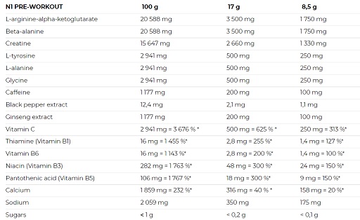 L-Arginin-alpha-Ketoglutarat, Beta-Alanin, Kreatin-Monohydrat, Inulin, Calciumphosphat, Natriumcitrat, Kreatin-Citrat, Säureregulator Zitronensäure, L-Ascorbinsäure, L-Tyrosin, L-Alanin, Glycin, Natriumchlorid, Koffein, Ginseng-Extrakt (5% Ginsenoside), Aroma, Mischung aus Rote-Bete-Konzentrat und Spirulina-Extrakt, Nicotinamid, schwarzes Karottenkonzentrat, Süßstoffe Sucralose und Steviolglykoside, Trennmittel Siliciumdioxid, Calcium-D-Pantothenat, Pyridoxinhydrochlorid, Thiaminhydrochlorid, Extrakt aus schwarzem Pfeffer (95% Piperin) – Bioperine®. Das Produkt kann Spuren von Soja- und Milcheiweiß enthalten.
