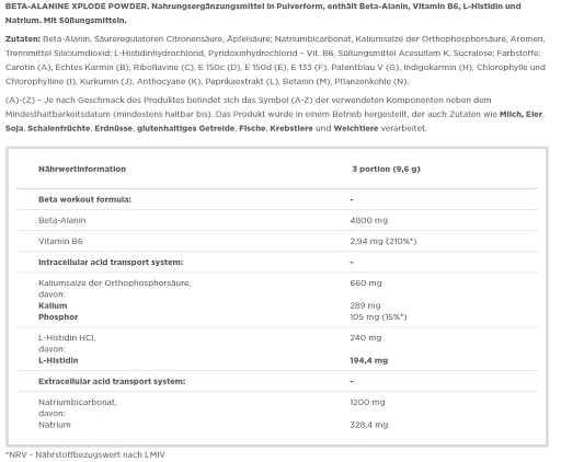 Dies ist ein weiteres Produkt aus der einzigartigen Xplode-Serie, die von Profisportlern und Liebhabern der körperlichen Aktivität geschätzt wird. Sie umfasst die Nahrungsergänzungsmittel, die sich durch hervorragende Löslichkeit, hohe Aufnahmefähigkeit von Wirkstoffen, sensationelle Geschmacksrichtungen und hervorragende Qualität von anwendungssicheren, auf Reinheit geprüften Rohstoffen auszeichnen! Wenn Sie sich für Präparate der Xplode-Serie entscheiden, einschließlich für Formel von Olimp Beta-Alanine Xplode Powder, können Sie sich sicher sein, dass Sie ein Nahrungsergänzungsmittel erhalten, das mit moderner Produktionstechnologie nach pharmazeutischem Standard hergestellt wird!
