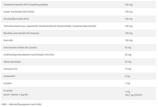 die Mischung von Extrakten verschiedener Obst- und Gemüsesorten (Weintraube, Grüner Tee, Mohrrüben, Tomate, Heidelbeere, Broccoli, Kohl, Zwiebel, Knoblauch, Weizenkeime, Grapefruit, Spargeln, Papaya, Ananas, Erdbeere, Apfel, Aprikose, Kirsche, Orange, Johannisbeere, Oliven, Gurken), Traubenkernextrakt (Vitis vinifera L.), Grüner Tee Blatt-Extrakt (Camellia sinensis L.), Zitrusbioflavonoide, Rhodiola rosea Wurzel-Extrakt (Rhodiola rosea L.), Quercetin, Japanischer Staudenknöterich Wurzel-Extrakt (Polygonum cuspidatum, 98% Trans-Resveratrol), Füllstoff mikrokristalline Cellulose; Artischocken Blatt-Extrakt (Cynara scolymus L.), Astaxanthin, großfrüchtige Moosbeere Frucht-Extrakt (Vaccinium macrocarpon Ait.), Alpha-Liponsäure, Coenzym Q10, Traubenschalen-Extrakt (Vitis vinifera L., 95% Trans-Resveratrol), Lycopen, ß-Carotin – Vit. A, Trennmittel Magnesiumsalze der Speisefettsäuren; Kapsel (Gelatine, Farbstoffe: E 171, E 132, E 172).