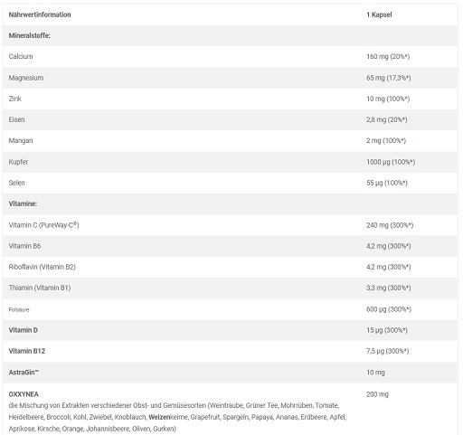 Mineralstoffe [Calciumbisglycinat, Magnesiumbisglycinat, Zinkbisglycinat, Eisenbisglycinat, Mangan-Bisglycinat, Natriumselenit, Kupferbisglycinat], Vitamine [mikroverkapselten L-Ascorbinsäure (PureWay-C®) – Vit. C, Cyanocobalamin – Vit. B12, Cholecalciferol – Vit. D, Pyridoxinhydrochlorid – Vit. B6, Riboflavin – Vit. B2, Thiaminmononitrat – Vit. B1, Pteroylmonoglutaminsäure – Folat]; Trennmittel Magnesiumoxid, Magnesiumsalze der Speisefettsäuren; Füllstoff mikrokristalline Cellulose; AstraGin™ (Extraktmischung – Panax notoginseng und Astragalus membranaceus), Kapsel (Gelatine, Farbstoff E 171).