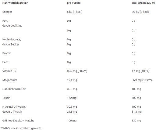 Wasser, Kohlendioxid, Säure – Zitronensäure; Taurin, Magnesiumlactat, Grünteeblattextrakt – Matcha ( Camellia sinensis (L.) Kuntze), Farbstoff – E 150a; Aromen, N-Acetyl-L-Tyrosin, natürliches Koffein (aus grünen Kaffeebohnen), Süßungsmittel – Sucralose, Acesulfam K; Pyridoxinhydrochlorid – Vitamin B6