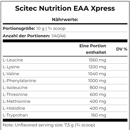 EAA Xpress enthält alle essentiellen Aminosäuren in den von der Weltgesundheitsorganisation (WHO) empfohlenen Verhältnissen. Bei einer ausgewogenen Ernährung sorgt EAA Express dafür, dass es dir nicht an essentiellen Aminosäuren mangelt – und wir alle wissen, dass eine ausreichende Versorgung mit Aminosäuren für uns alle von größter Bedeutung ist!