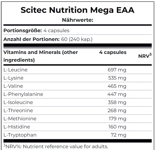 Mega EAA enthält alle essentiellen Aminosäuren in den von der Weltgesundheitsorganisation (WHO) empfohlenen Verhältnissen. Die richtige Zufuhr von essentiellen Aminosäuren ist das A und O einer guten Ernährung. Mega EAA hilft dabei alle essentiellen Aminosäuren zum richtigen Zeitpunkt und im richtigen Verhältnis dem Körper zur Verfügung zu stellen.