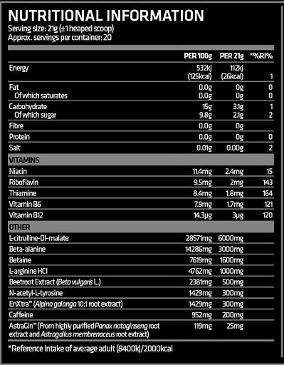 Zutaten: L-Citrulin Malat, Polydextrose, Beta-Alanin, Fructose, Betain Anhydrous, L-Arginin, Zitronensäure, Rote Beeteextrakt, Geschmacksstoff, Koffein Anhydrous, EnXtraTM (Alpina alanga 10:1 Wurzel Extrakt), N-Acetyl-L-Tyrosin, Süßungsmittel (Sucralose, Acesulfam-K), Farbstoff (Sunset Yellow, Quinoline Yellow), Kaliumchlorid, AstraGINTM (hochreine Panax Notoginseng Wurzelextrakt 25mg und Astragallus membrenaceus Wurzel Ektrakt), Cyanocobalamin, Riboflavin, Pyridoxin-Hydrochlorid, Nikotinsäure, Thiamin