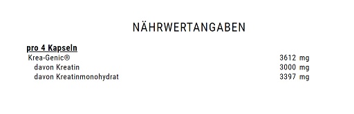 Krea-Genic® (Kreatinmonohydrat, Säureregulator: E500), Hydroxymethylcellulose (Kapselhülle), Füllstoff: E460; Trennmittel: E551, E470b. Kann Spuren von Milch, Gluten, Soja und Ei enthalten.