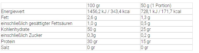 Reismehl, Reisprotein, gemahlener Zimt, Apfelpulver, Aroma, Süßungsmittel: Acesulfam K und Sucralose, Säureregulator – Citronensäure, Farbstoff – Carotine.