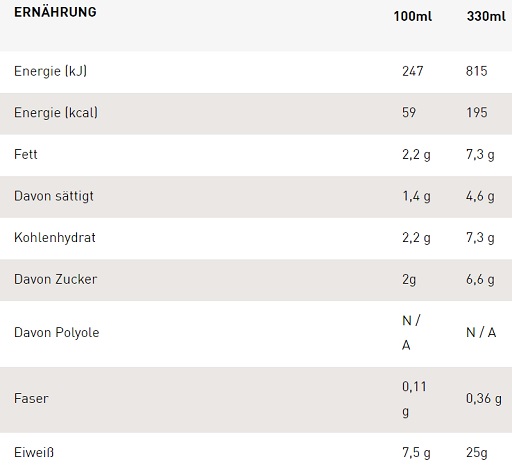 Wasser, Magermilch (27%), Proteinmischung (Calciumkaseinat (Milch), Molkenprotein (Milch)), Sahne (Milch) (5%), Schokoladenpulver (2,1%) (alkalisiertes Kakaopulver, Zucker), Stabilisatoren: Gellan Gum, Carrageenan; Süßstoffe: Acesulfam-Kalium, Sucralose; Salz, natürliche Aromen, Enzym: Laktase.